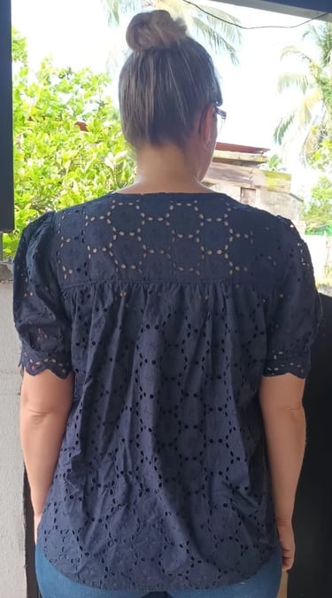 Après plusieurs heures de couture et quelques petites finitions, le résultat était tout simplement parfait ! La blouse avait pris forme et je pouvais déjà imaginer à quel point Marion serait heureuse de la porter. C’est un vrai bonheur de voir un projet couture se concrétiser avec succès, surtout lorsque l'on travaille pour une cliente aussi agréable. Marion était effectivement ravie du résultat final et ne pouvait s'empêcher de sourire en essayant sa nouvelle blouse pour la première fois.